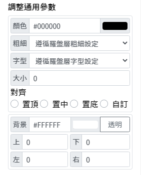 文字颜色 栏位中文字的颜色. 文字粗细 当选项为遵循罗盘层粗细设定时, 便会遵循切换标籤:文字 当中对于文字粗细的设定. 若于此设定粗细时, 栏位中的文字样式会以此设定为主. 字型 当选项为遵循罗盘层字型设定时, 便会遵循切换标籤:文字 当中对于文字字型的设定. 若于此设定字型时, 栏位中的文字样式会以此设定为主. 文字大小 当选项为0时, 便会遵循切换标籤:文字 当中对于文字大小的设定. 若于此设定字型大小(大于0)时, 栏位中的文字大小会以此设定为主. 背景颜色 可赋予栏位具有不同颜色的背景. 间距 提供四个方向的背景色间距调校. 栏侧文字 提供栏位四个角落可输入文字, 同样具有颜色、文字大小、粗细等设定.